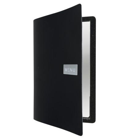 Porta menù in pelle ecologica, flessibile e facile da pulire. La placca in metallo stampato lo rende particolarmente elegante. Comprende 1 inserto doppio interno (per 4 fogli) in plastica cristallo, trattenuto da un elastico sul dorso. Ogni porta menù è fornito con una targhetta metallica extra da personalizzare con il proprio logo. Dimensioni: 24 x 33cm. Può contenere fino a 10 inserti doppi per un totale di 40 facciate.