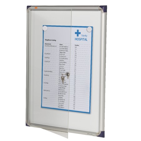 Ad ante scorrevoli. Nuovo design con robusta cornice in alluminio e vetro di sicurezza di 4mm. fondo fondo in acciaio bianco magnetico per uso con magnetini o scrivibile con pennarelli a secco. Fissaggio semplice effettuabile da una sola persona. Chiusura con doppia serratura. f.to 8xa4: dim.est. 692x972x54mm