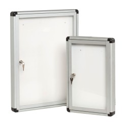 Ad anta battente. Nuovo design con robusta cornice in alluminio e vetro di sicurezza di 4mm. fondo fondo in sughero per uso con puntine. Fissaggio semplice effettuabile da una sola persona. Serratura con 2 chiavi. Apertura istallabile sia a destra che a sinistra. f.to 6xa4. DImensioni: 70,8x66,7x4,3cm