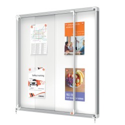 Bacheca extrapiatta per esporre comunicazione in corridoi e passaggi stretti. Cornice in alluminio anodizzato con angoli in colore blu. Anta munita di serratura con due chiavi in dotazione. L'anta si apre con angolo di 135°. Telaio con fondo in metallo bianco brillante. Profondità interna per 11mm. fornita con normali fissaggi per il montaggio a parete. Dimensioni: 81,5x67cm è possibile esporre 6 fogli f.to a4