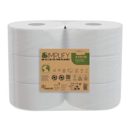 Carta igienica bianca microgoffrata 100% in carta riciclata rigenerata 2 veli microgoffrata. In rotolo MINI JUMBO 150mt, 405strappi. Diametro rotolo 19,5cm. Diametro anima 7,6cm. Strappo: 9,1x37cm.