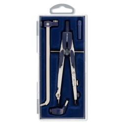 Compasso con meccanismo a frizione e rotella per regolazione micrometrica; con prolunga e innesto universale; per cerchi dal diametro massimo di 360 mm, con prolunga fino a 560 mm. Compasso adatto ad uso scolastico e professionale. Garantiti a vita. Astuccio in plastica contenente 3pz: compasso, tubetto porta mine + allunga telescopica per cerchi fino a 155mm SET DA 3 PEZZI (1 COMPASSO STOP SYSTEM, 1 ADATTATORE UNIVERSALE, 1 ASTUCCIO MINE). PARTICOLARITA' DEL COMPASSO E' LA LEVA BREVETTATA PER IL BLOCCO DELLE ASTE. Balaustrone a regolazione rapida con design innovativo e moderno, apertura delle aste ergonomica e semplice. Per cerchi fino a diametro mm 340. Parti di ricambio e mine incluse.