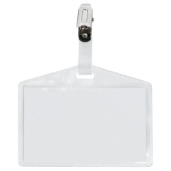 Portanome in polistirene rigido, aperto per agevolare l'eventuale lettura di chip a radiofrequenza o timbratura, utilizzabile sia orizzontalmente sia verticalmente, agganciabile.