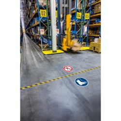 Segnaletica da terra per l'identificazione di aree pericolose, spazi di stoccaggio, passaggi pedonali ecc. Resistenza allo scivolamento R9 e conforme alla normativa DIN 51130. Conforme alla normativa UNI EN ISO 7010. Pittogrammi di sicurezza autoadesive per applicazioni su pavimenti in ambienti interni, come magazzini, centri di distribuzione, produzione, ecc. Resistente all'abrasione.